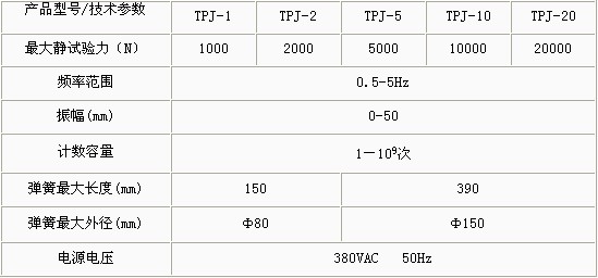 產(chǎn)品概述: TPJ系列機(jī)械式彈簧疲勞試驗(yàn)機(jī)主要應(yīng)用于拉伸、壓縮螺旋彈簧的疲勞壽命試驗(yàn) 功能特點(diǎn): 振幅、頻率可調(diào);振動(dòng)次數(shù)及頻率數(shù)字顯示; 預(yù)置試驗(yàn)次數(shù)自動(dòng)停機(jī);可做單對(duì)或多對(duì)彈簧的試驗(yàn)機(jī); 操作簡(jiǎn)單、運(yùn)行可靠。 技術(shù)參數(shù):