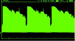 圖2是無Z軸亮度調(diào)制較老數(shù)字示波器的顯示。雖然該示波器甚至在5ms/div時仍有捕獲信號細節(jié)的足夠采樣率和存儲器深度但所有捕獲點的顯示亮度相同。這就在視覺上丟失了信號包絡(luò)內(nèi)的波形細節(jié)。因此在選擇模擬示波器技術(shù)還是選擇較老的數(shù)字顯示技術(shù)上不應(yīng)對今天視頻實驗室中充斥模擬示波器感到驚奇!
