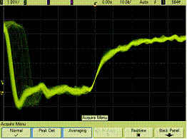 圖5中也示出由相同單次采集放大得到的兩幅圖像。通過采用該示波器的高分辨率顯示技術(shù)我們能在經(jīng)放大100倍的中間圖像中看到明亮的垂直矢量(靠近顯示中心)。對脈寬調(diào)制(PWM)突發(fā)的進一步波形擴充(20,000:1)揭示在右面有一個毛刺。而只有淺存儲器深度的其它便攜式DSO不能示出如這些屏幕圖像所示水平的細節(jié)。